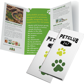 These Trifold Product Brochures are a perfect tool to hand out to friends, family and others that might be interested in learning about the quality products that PetClub 247 offers.